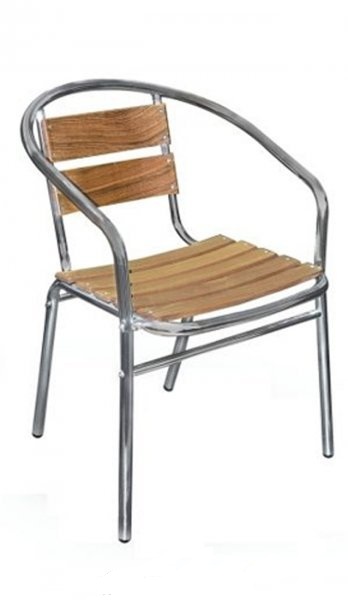 Стілець на алюмінієвому каркасі з дерев"яними планками та зручною спинкою з підлокітниками.